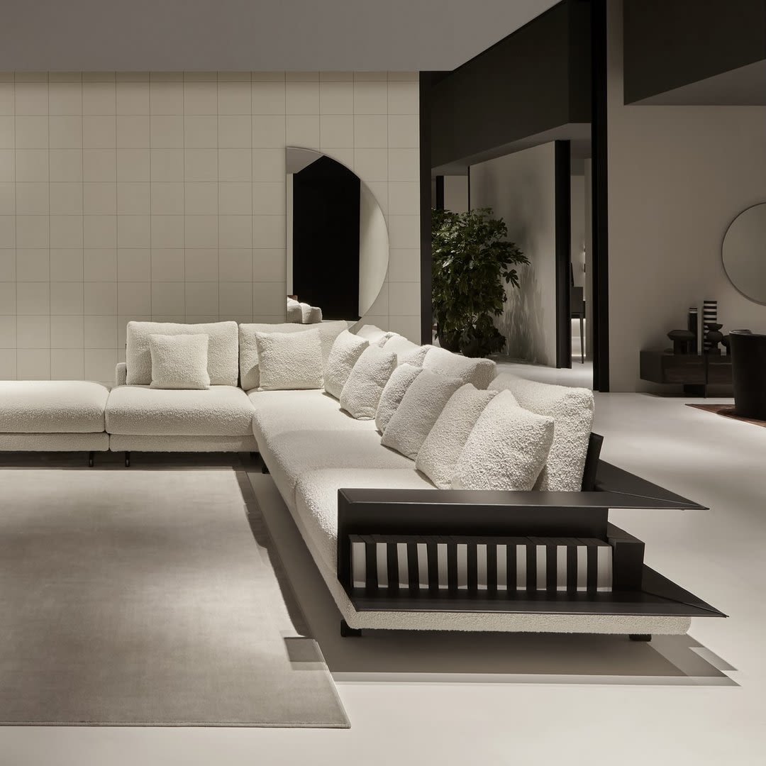 The square forms of Neverland, a sequence of volumes and interplaying full and empty spaces, come together to create a significant and even expansive island. This series of rigid elements and geometric angles is designed with precision, featuring thin profiles and proportional balance. These elements provide practical support surfaces and storage for books and objects, enhancing the sofa's functionality and elevating the aesthetic of its back.
