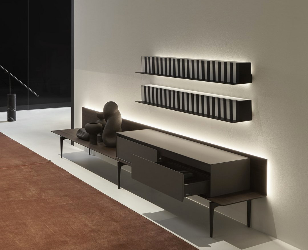 The Fox sideboard features an interplay of horizontal volumes, interrupted by load-bearing shoulders