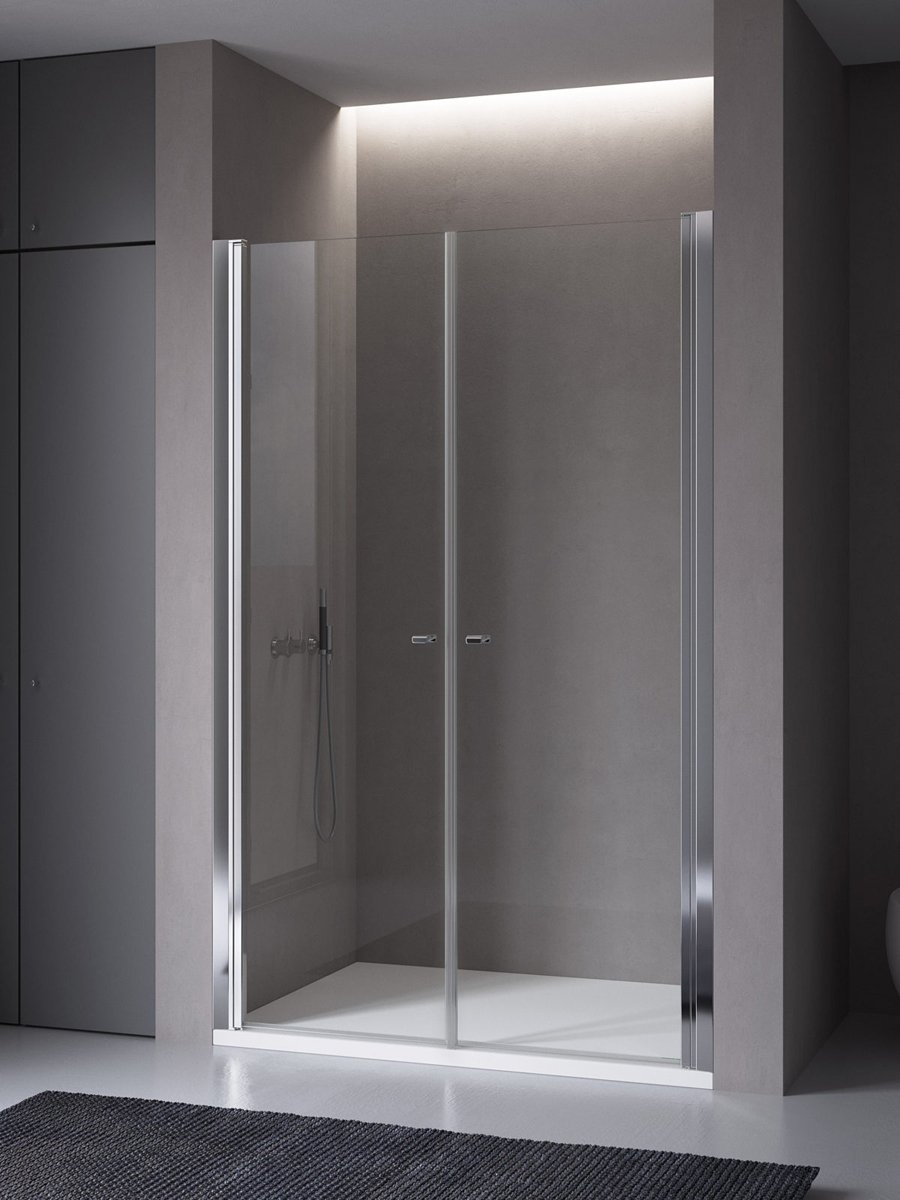 Door with two doors in line (internal/external opening) L91cm (extensibility +/- 1.5 cm), transparent glass thickness 6 mm, profiles in polished steel.