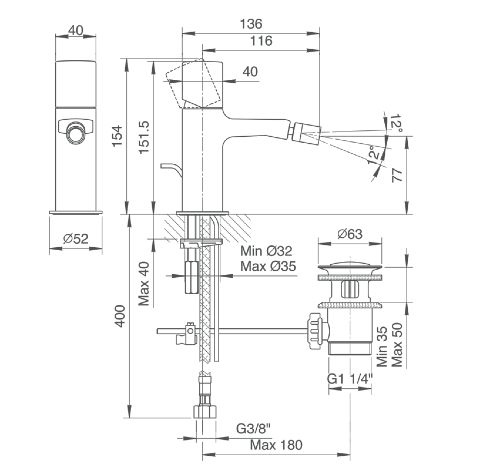 Single-hole bidet mixer. Spout projection 11,6 cm. Handle. Flow restrictor 5 l/min at 3 bar. Articulated aerator. Flexible supply lines. With waste. Chrome finish.