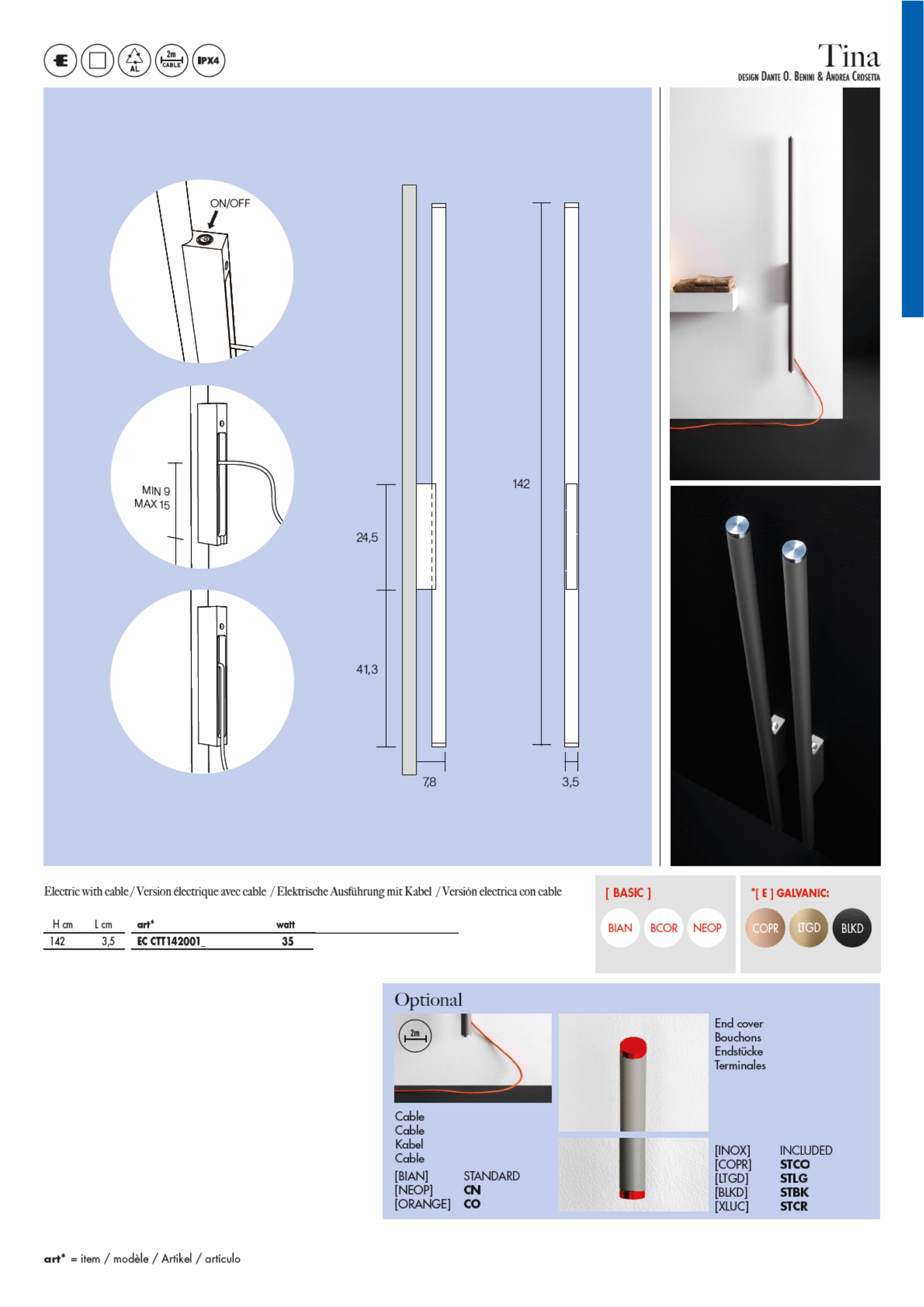 Possibilità di acquistarlo con cavo elettrico color arancio e con il terminale di chiusura in 4 finiture galvaniche.