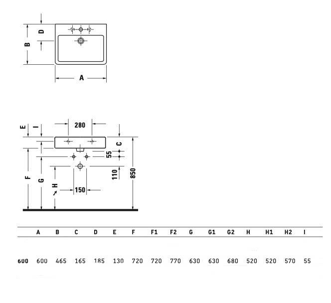 Lavabo con troppopieno, con bordo per rubinetteria monoforo, lato inferiore smaltato, 60x47 cm.