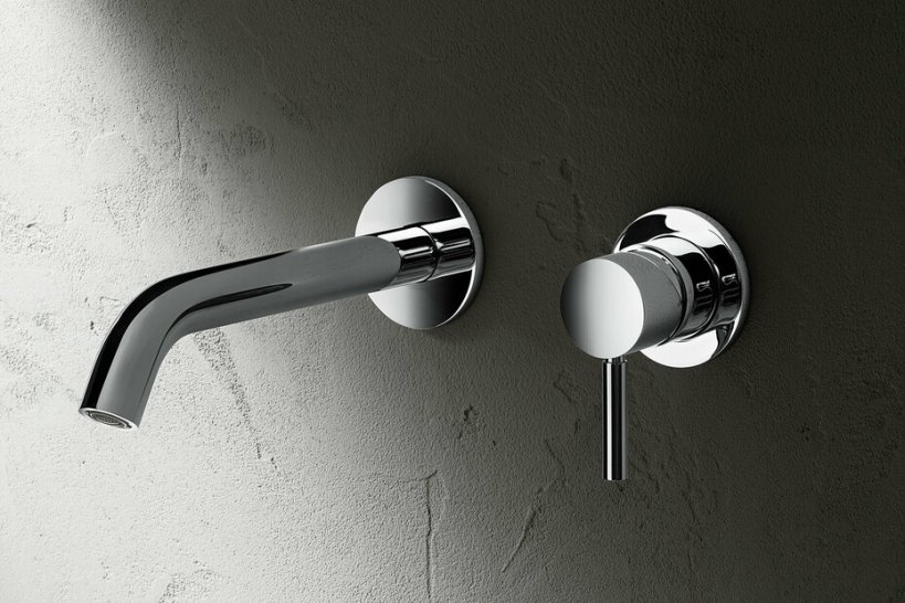 Miscelatore lavabo da parete con cartuccia tradizionale, interasse bocca 20 cm, maniglia cilindrica con leva, con rosoni, limitatore di portata 5 l/min a 3 bar, ingressi da 1/2", senza scarico, finitura nero opaco.