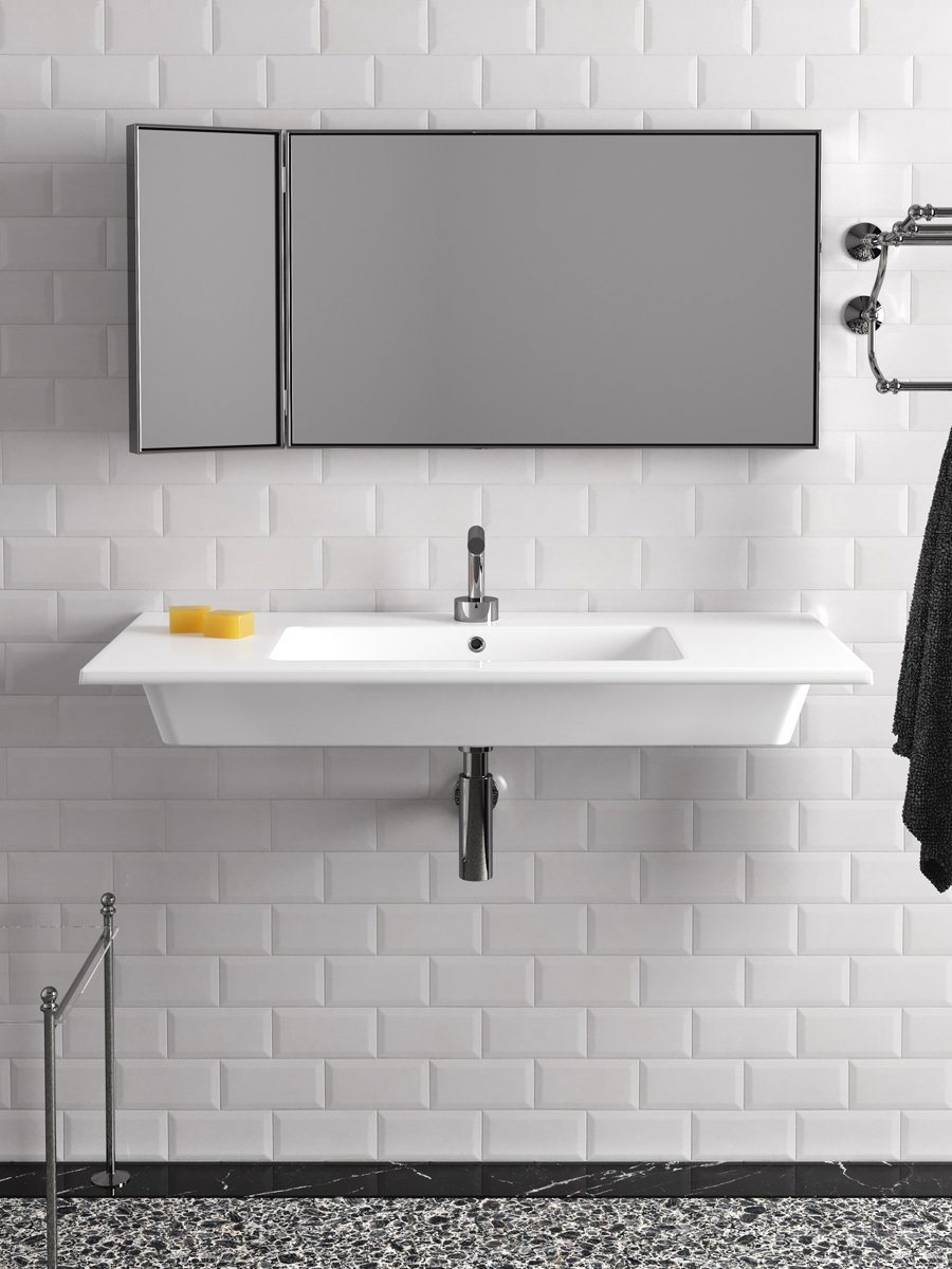 Lavabo 101x46 cm, monoforo, installazione sospesa o incasso soprapiano.